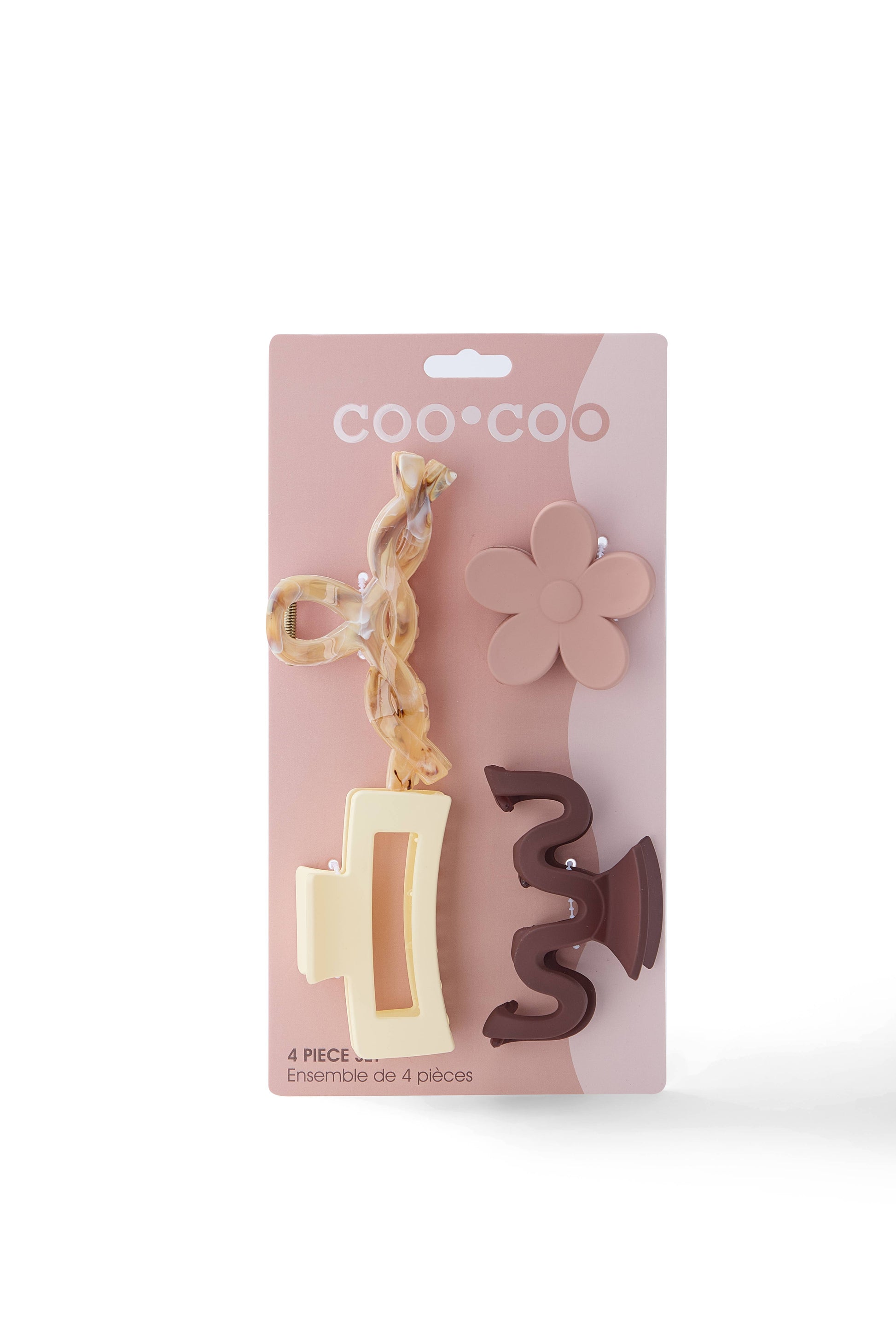 A chic set of four hair claws, one in an acrylic finish and in hazelnut marble, offering a modern yet elegant look. Perfect for stores seeking trendy and durable accessories.