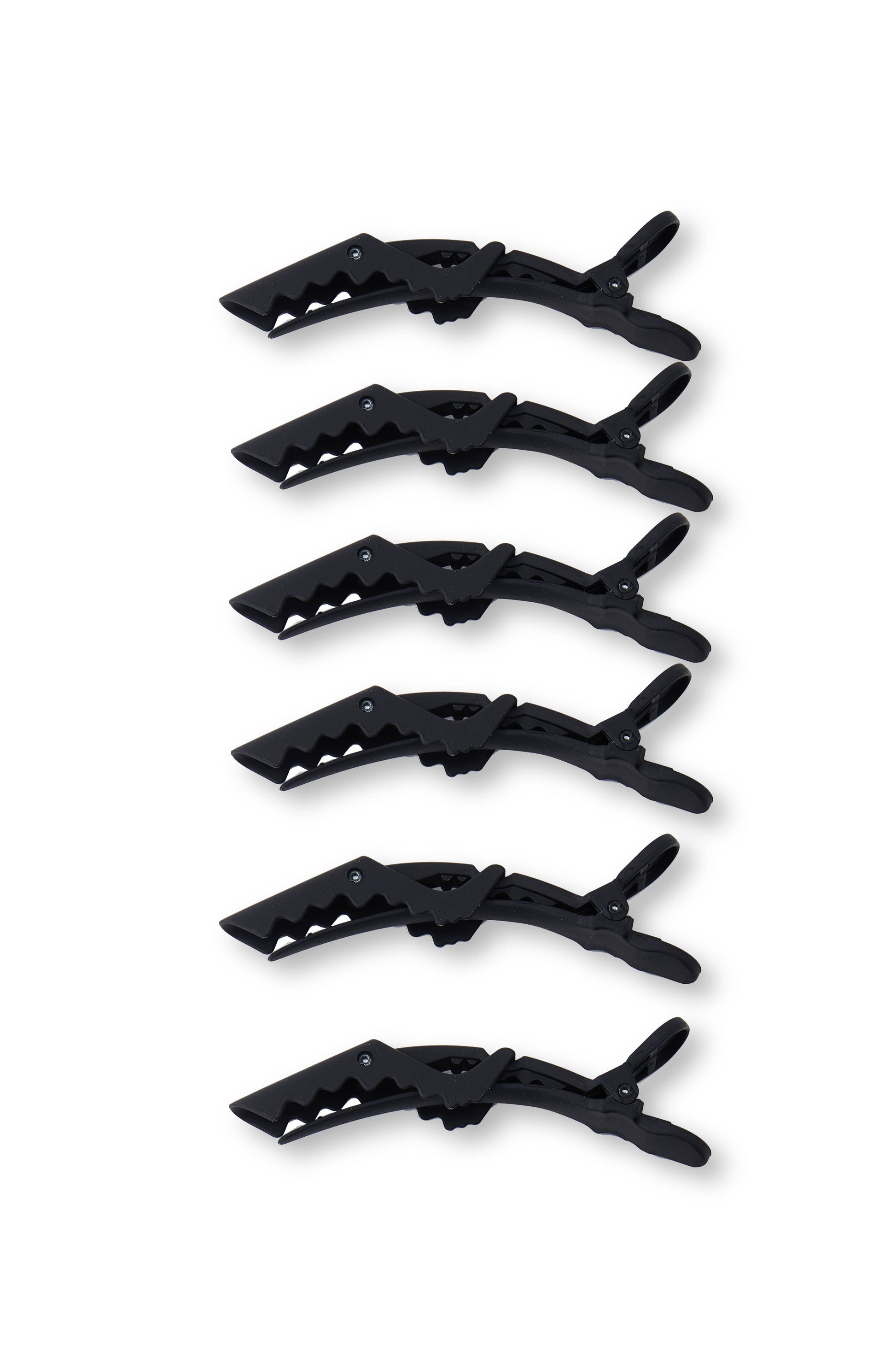 A set of six 'no-slip' prep clips in jet black, providing a practical yet stylish option for every hair type. Ideal for retailers offering functional, reliable styling tools.